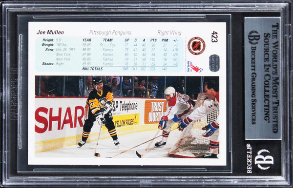 This Autographed 1990 Upper Deck #423 Card has been Personally Signed by Joe Mullen of the Pittsburgh Peguins. This item is 100% Authentic, it comes slabbed and authenticated by Beckett Authentication Services. The authenticity can be verified on Beckett Authentication Services website.