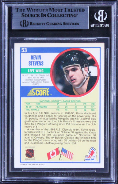 This Autographed 1990 Score #53 Card has been Personally Signed by Kevin Stevens of the Pittsburgh Peguins. This item is 100% Authentic, it comes slabbed and authenticated by Beckett Authentication Services. The authenticity can be verified on Beckett Authentication Services website.