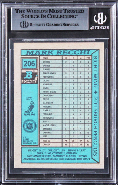This Autographed 1990 Bowman #205 Card has been Personally Signed by Mark Recchi of the Pittsburgh Peguins. This item is 100% Authentic, it comes slabbed and authenticated by Beckett Authentication Services. The authenticity can be verified on Beckett Authentication Services website.