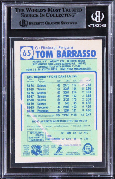 This Autographed 1990 O-Pee-Chee #65 Card has been Personally Signed by Tom Barrasso of the Pittsburgh Peguins. This item is 100% Authentic, it comes slabbed and authenticated by Beckett Authentication Services. The authenticity can be verified on Beckett Authentication Services website.