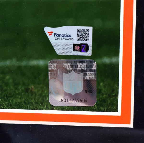The product is an autographed 16x20 photo of Peyton Manning in his Denver Broncos jersey, framed for display. The signature and authenticity are guaranteed by Fanatics Authentic, making it a valuable piece for any football fan or collector. This authentic and original memorabilia allows fans to own a piece of football history, showcasing Mannings association with the Denver Broncos during his career.Framed Size: 28"x30"