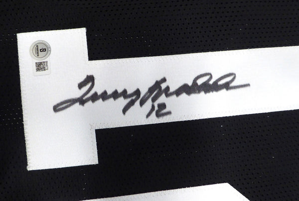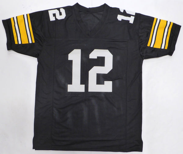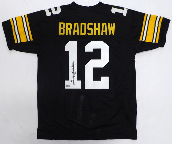 This is a Black Jersey that has been hand signed by Terry Bradshaw. This is a custom jersey with no name brand. The approximate size is XL. It has nice sewn in name and numbers. This item has been certified authentic by Beckett Authentication (BAS) and comes with their tamper-proof QR Code sticker that can be verified on the Beckett-authentication.com.