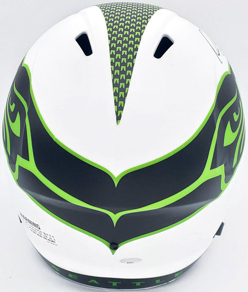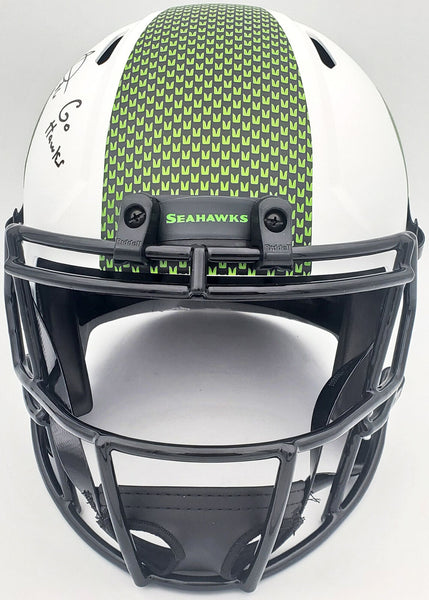 This is a Seattle Seahawks Lunar Eclipse White Full Size Replica Speed Helmet that has been hand signed by Quandre Diggs. The Eclipse helmets are very delicate and often have some marks or scratches on them. This item was inscribed "Go Hawks." This item was signed in the presence of a Mill Creek Sports representative and comes with their serial numbered hologram and matching certificate of authenticity.