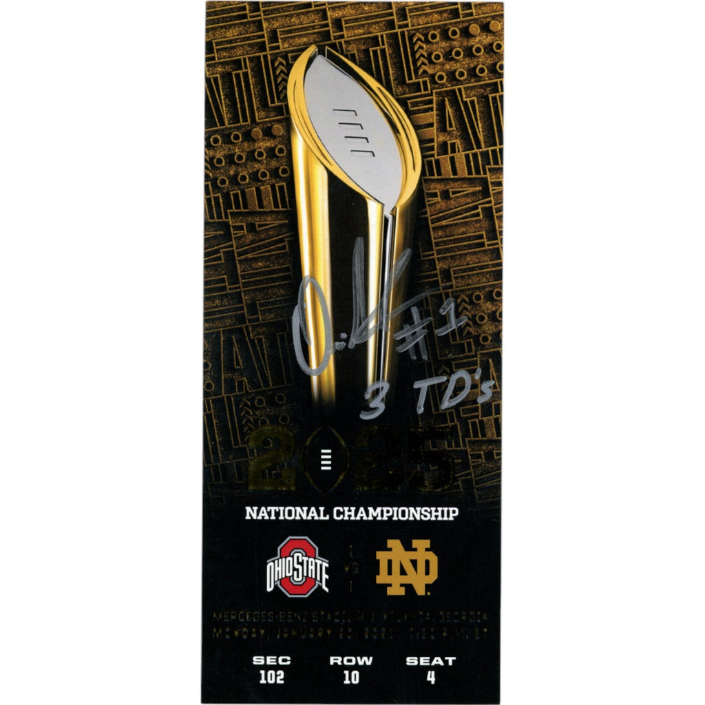 The number in the listing title is just an inventory sku for our records and is not the authentication number. The item pictured is a stock photo unless otherwise noted. This is an Ohio State Buckeyes 2024 National Champions Replica Ticket Stub that was personally autographed by Quinshon Judkins includes "3 TD's" inscpription. Includes a certificate of authenticity from Beckett Authentication Services (BAS) and Denver Autographs.FREE SHIPPING within the USA on orders over $10!