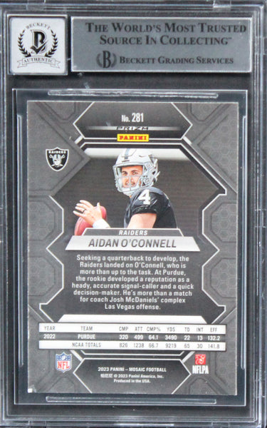 This Autographed Auto Graded Gem Mint 10! 2023 Panini Mosaic Mosaic Green #281 Rookie Card has been Personally Signed by Aidan O'Connell of the Las Vegas Raiders. This item is 100% Authentic, it comes slabbed and authenticated by Beckett Authentication Services. The authenticity can be verified on Beckett Authentication Services website.