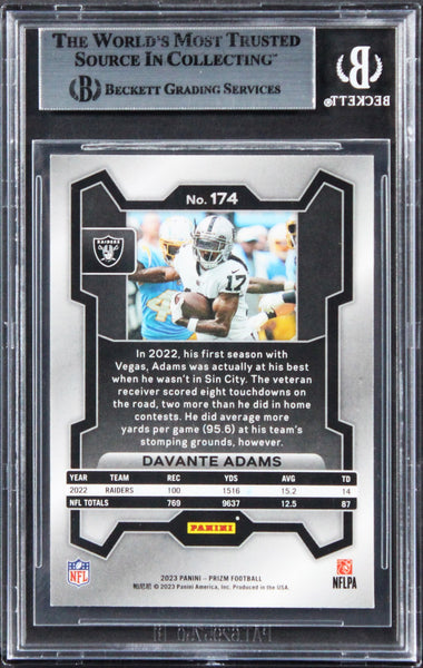This Autographed 2023 Panini Prizm #174 Card has been Personally Signed by Davante Adams of the Las Vegas Raiders. This item is 100% Authentic, it comes slabbed and authenticated by Beckett Authentication Services. The authenticity can be verified on Beckett Authentication Services website.