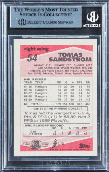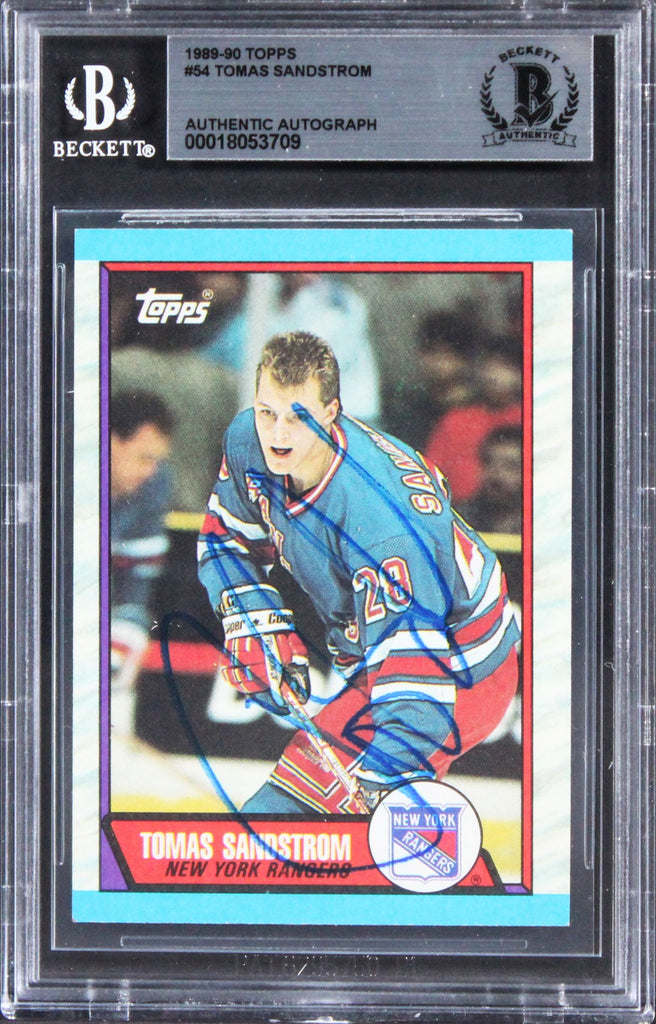 This Autographed 1989 Topps #54 Card has been Personally Signed by Tomas Sandstrom of the New York Rangers. This item is 100% Authentic, it comes slabbed and authenticated by Beckett Authentication Services. The authenticity can be verified on Beckett Authentication Services website.