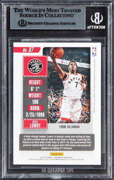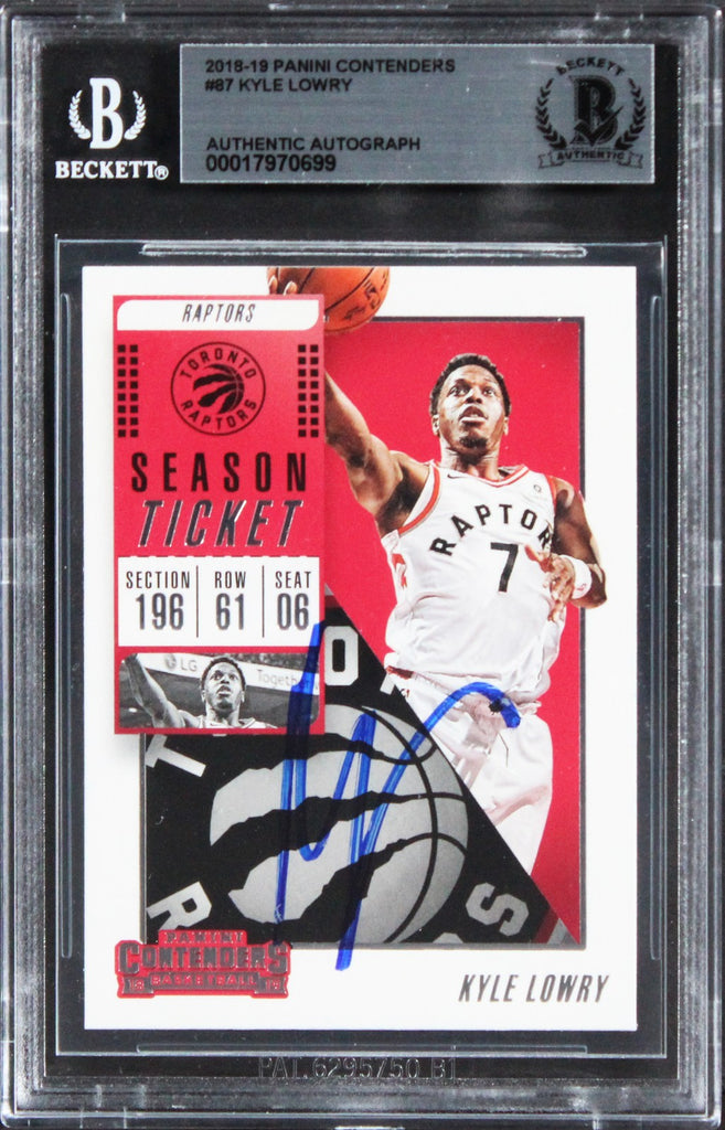 This Autographed 2018 Panini Contenders #87 Card has been Personally Signed by Kyle Lowry of the Toronto Raptors. This item is 100% Authentic, it comes slabbed and authenticated by Beckett Authentication Services. The authenticity can be verified on Beckett Authentication Services website.