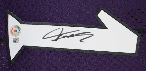 This Autographed Purple Mitchell & Ness Hardwood Classics Swingman Jersey has been Personally Signed by Tracy McGrady of the Toronto Raptors. This item is 100% Authentic to include a hologram by Beckett Authentication Services. This item will come with an affixed Beckett Authentication Services (BAS) authentication sticker, which includes a scannable QR code to verify authenticity. Please note that Beckett no longer provides serial-numbered COA cards, and the attached BAS sticker will serve as the complete authentication for this item. This is a BAS Witnessed Protection Program item which means a Beckett Authentication Service representative was present when this item was being signed. We conducted an autograph signing with Tracy McGrady where multiples of the same item were signed. While the photographs are representative of this item, the size, placement and strength of the signature may vary. Each item is hand signed, therefore, each autograph is unique. This item can be verified through BAS Witnessed. This is a X-Large sized, non-branded, custom-stitched Jersey.