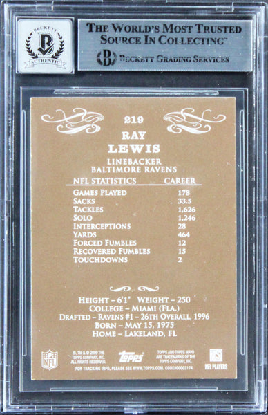 This Autographed Auto Graded Gem Mint 10! 2009 Topps Mayo #219 Card has been Personally Signed by Ray Lewis of the Baltimore Ravens. This item is 100% Authentic, it comes slabbed and authenticated by Beckett Authentication Services. We have multiples of this same item. While the photographs are representative of this item, the size and placement of the signature may vary. Each item is hand signed, therefore, each autograph is unique.