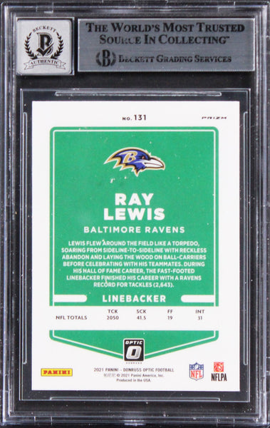 This Autographed Auto Graded Gem Mint 10! 2021 Donruss Optic Holo #131 Card has been Personally Signed by Ray Lewis of the Baltimore Ravens. This item is 100% Authentic, it comes slabbed and authenticated by Beckett Authentication Services. We have multiples of this same item. While the photographs are representative of this item, the size and placement of the signature may vary. Each item is hand signed, therefore, each autograph is unique.