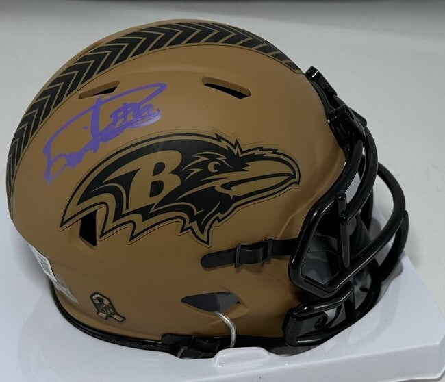 Riddell 2023 SALUTE TO SERVICE Speed Mini Helmet hand signed by Baltimore Ravens Running Back DERRICK HENRY The signature is in Purple paint pen. This would make a great addition to any Ravens collection. This item is guaranteed to be 100% authentic and will include a COA hologram from Beckett Authentication.