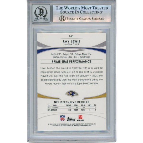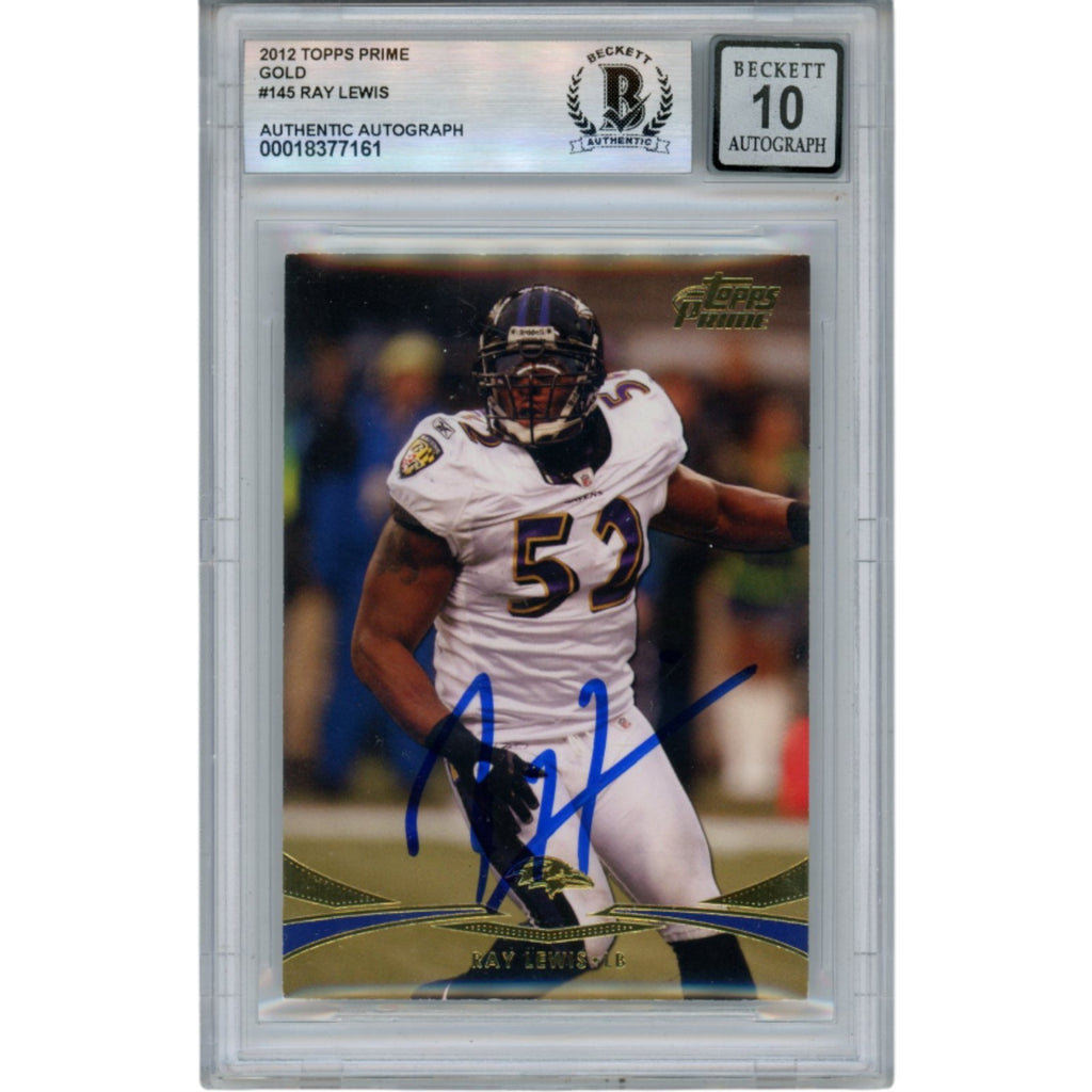 The number in the listing title is just an inventory sku for our records and is not the authentication number. The item pictured is the exact item you will receive, please see photos for condition. This is a Baltimore Ravens 2012 Topps Prime Hobby Gold #145 Slabbed Trading Card that was personally autographed by Ray Lewis. Includes a certificate of authenticity / hologram from Beckett Authentication Services (BAS) and Denver Autographs. FREE SHIPPING within the USA on orders over $10!