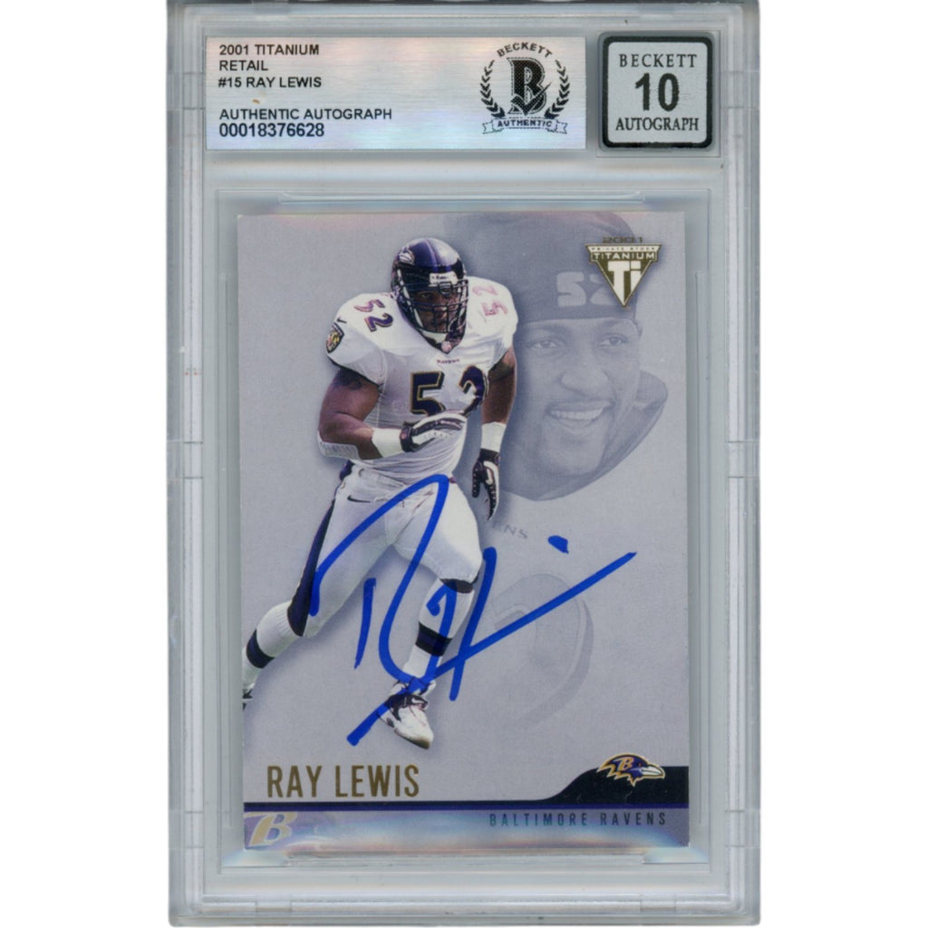 The number in the listing title is just an inventory sku for our records and is not the authentication number. The item pictured is the exact item you will receive, please see photos for condition. This is a Baltimore Ravens 2001 Pacific Private Stock #15 Slabbed Trading Card that was personally autographed by Ray Lewis. Includes a certificate of authenticity / hologram from Beckett Authentication Services (BAS) and Denver Autographs. FREE SHIPPING within the USA on orders over $10!