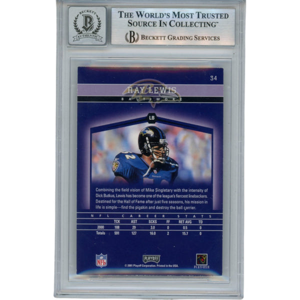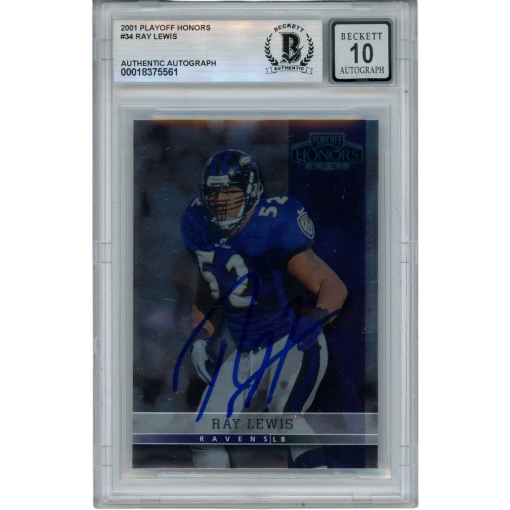 The number in the listing title is just an inventory sku for our records and is not the authentication number. The item pictured is the exact item you will receive, please see photos for condition. This is a Baltimore Ravens 2001 Playoff Honors #34 Slabbed Trading Card that was personally autographed by Ray Lewis. Includes a certificate of authenticity / hologram from Beckett Authentication Services (BAS) and Denver Autographs. FREE SHIPPING within the USA on orders over $10!