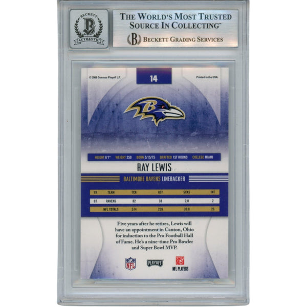 The number in the listing title is just an inventory sku for our records and is not the authentication number. The item pictured is the exact item you will receive, please see photos for condition. This is a Baltimore Ravens 2008 Playoff Absolute #14 Slabbed Trading Card that was personally autographed by Ray Lewis. Includes a certificate of authenticity / hologram from Beckett Authentication Services (BAS) and Denver Autographs. FREE SHIPPING within the USA on orders over $10!