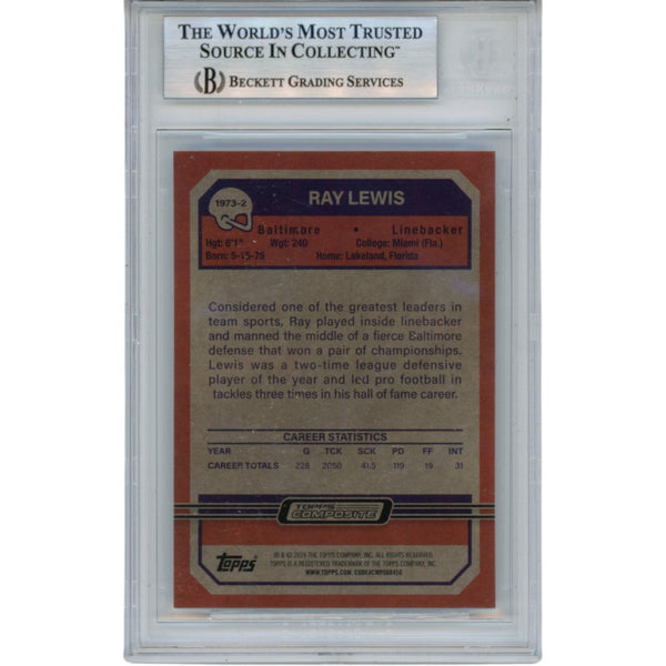 The number in the listing title is just an inventory sku for our records and is not the authentication number. The item pictured is the exact item you will receive, please see photos for condition. This is a Baltimore Ravens 2023 Topps Composite #1973-2 Slabbed Trading Card that was personally autographed by Ray Lewis. Includes a certificate of authenticity / hologram from Beckett Authentication Services (BAS) and Denver Autographs. FREE SHIPPING within the USA on orders over $10!
