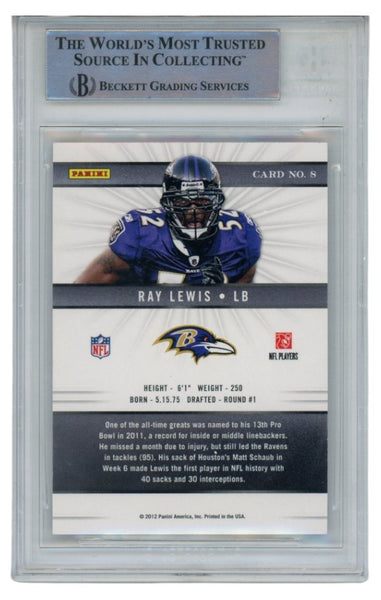 The number in the listing title is just an inventory sku for our records and is not the authentication number. The item pictured is the exact image you will receive, please see photos for condition. This is a Baltimore Ravens 2002 Elite #8 Slabbed Trading Card that was personally autographed by Ray Lewis. Includes a certificate of authenticity from Beckett Authentication Services (BAS) and Denver Autographs. FREE SHIPPING within the USA on orders over $10!