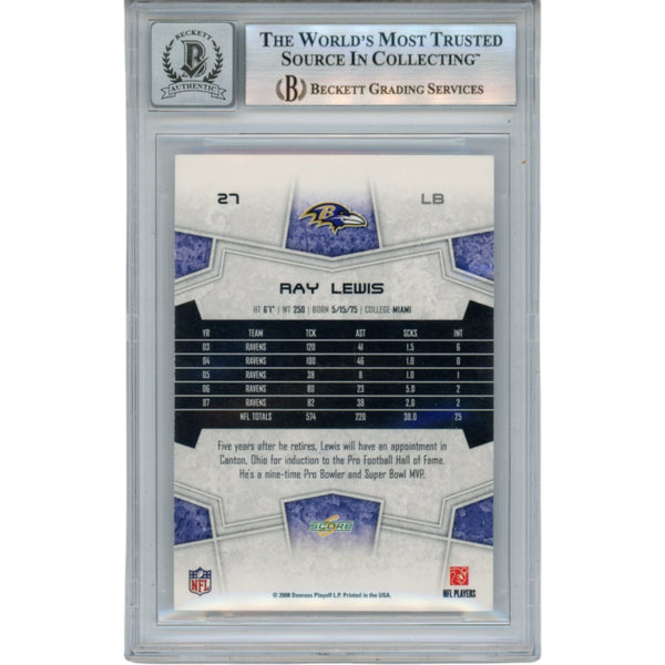 The number in the listing title is just an inventory sku for our records and is not the authentication number. The item pictured is the exact item you will receive, please see photos for condition. This is a Baltimore Ravens 2008 Score #27 Slabbed Trading Card that was personally autographed by Ray Lewis. Includes a certificate of authenticity / hologram from Beckett Authentication Services (BAS) and Denver Autographs. FREE SHIPPING within the USA on orders over $10!