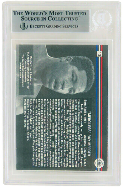 Ray Mercer signed 1991 Ringlords boxing trading card #13 with 'Merciless' inscription. The card has been authenticated and encapsulated by Beckett Authentic and the authentication number can be verified online. The image of the item is a stock photo, as we may have multiples of the item in stock. The Slabbed Card you will receive will be of the card described. (Same grade, Same authentication) You may or may not receive the exact Beckett serial number on the slab label shown in image.