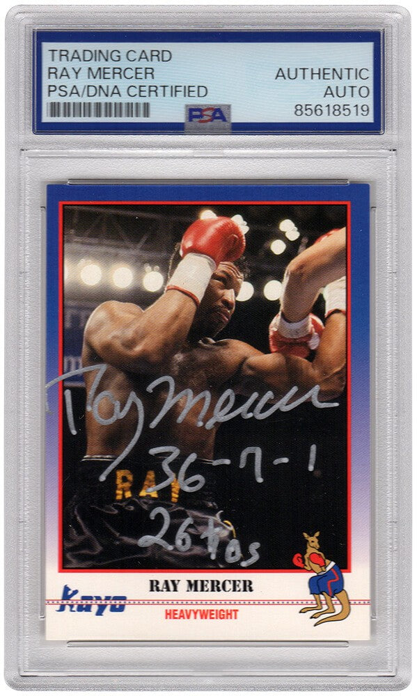 Ray Mercer signed 1991 Kayo boxing trading card #117 with '36-7-1, 26 KO's' inscription. The card has been authenticated and encapsulated by PSA and the authentication number can be verified online.