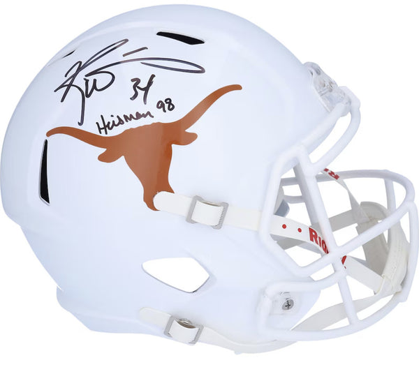 Ricky Williams Autographed/Inscribed "Heisman 98" Texas Longhorns Speed Full Size Helmet FanaticsThis full size speed helmet has been personally hand-signed by Ricky Williams. It is officially licensed by the NCAA and comes with an individually numbered, tamper-evident hologram from Fanatics Authentic. To ensure authenticity, the hologram can be reviewed online. This process helps to ensure that the product purchased is authentic and eliminates any possibility of duplication or fraud.Comes with a tamper-evident hologram from Fanatics Authenticated MONEY BACK GUARANTEE! If for any reason you are not completely satisfied with the quality or authenticity of your purchase, we will gladly give you a full refund or exchange, whichever you prefer up to 30 days after purchase. Please feel free to e-mail us with any questions. Thank you. Authenticator Pre-Certified Authenticator: Fanatics Authenticated History of item: Ricky Williams has signed this item in the presence of a representative from Fanatics. Describe how you came to possess this item: Super Sports Center is a fully authorized dealer for Upper Deck Authenticated as well as Mounted Memories and Steiner Sports. Other information about you and / or the item: Super Sports Center strives to deliver the most authentic in sports memorabilia from trusted companies like Mounted Memories, Steiner Sports and Upper Deck Authenticated. If it exists, we can find it for you!