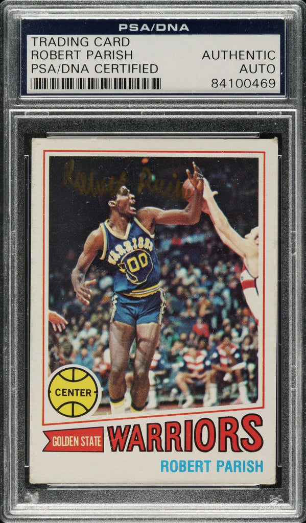 Featured is a Robert Parrish signed 1977/78 Topps #111 rookie card. This card has been hand signed by Parrish and has been authenticated and encapsulated by PSA. This card would make a great addition to any sports memorabilia collection! SPECIFICATIONS Autographed By: Robert Parrish Team: Golden State Warriors Sport: Basketball Authentication: Professional Sports Authenticator (PSA)