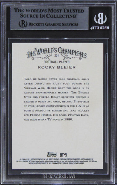 This Autographed 2021 Topps Allen & Ginter #201 Card has been Personally Signed by Rocky Bleier. This item is 100% Authentic, it comes slabbed and authenticated by Beckett Authentication Services. The authenticity can be verified on Beckett Authentication Services website.