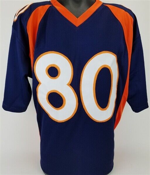 This Custom on-field style adult XL autographed jersey has been personally hand-signed by Rod Smith of the Denver Broncos. Smith added the inscription "2x SB Champs" along with his signature.This autograph is certified by James Spence Authentication's (JSA) Witnessed Protection Program. That means that a JSA representative was present when this item was signed. It comes with the numbered hologram and matching Certificate of Authenticity. Custom on-field style jerseys are a more affordable option for autograph seekers. These jerseys do not have any brand name or tags and are made in the Philippines. They feature stitched on names and numbers and are made to look very similar to the on-field jerseys that the players wear. These custom jerseys are very commonly used in the memorabilia industry.All Items are brand new unless otherwise stated. On all signed jerseys up for auction stock images are used in these listings. ALMOST ALL OUR SIGNED JERSEYS ARE ADULT XL unless otherwise noted (It's the preferred size for autograph collectors for display purposes) The exact item you will receive will be the Same player as the one pictured, but may have the signature in different spots, be signed in a different color paint pen, and have different inscriptions than the photo shown. WE ARE NOT A WHOLESALER, WE TRY TO OFFER LOW PRICED SIGNED JERSEYS TO OUR CUSTOMERS SO EVERYONE GETS A FAIR CHANCE AT LOW PRICES ON QUALITY ITEMS. If you're buying multiple items please don't pay until you purchase all your auction items for that week (Thursday thru Sunday) We'll send you an invoice when all our weekly auctions are over on either Saturday or Sunday evening at 10:30 pm depending on how many items we have listed that week. We will adjust your shipping at this point. 1st item $13, each additional is $3.more. Thank you & Happy Bidding ALL INTERNATIONAL SHIPPING ON THESE ITEMS IS DONE THROUGH THE eBAY GLOBAL SHIPPING PROGRAM. PLEASE BE AWARE OF THESE COSTS BEFORE BIDDING.