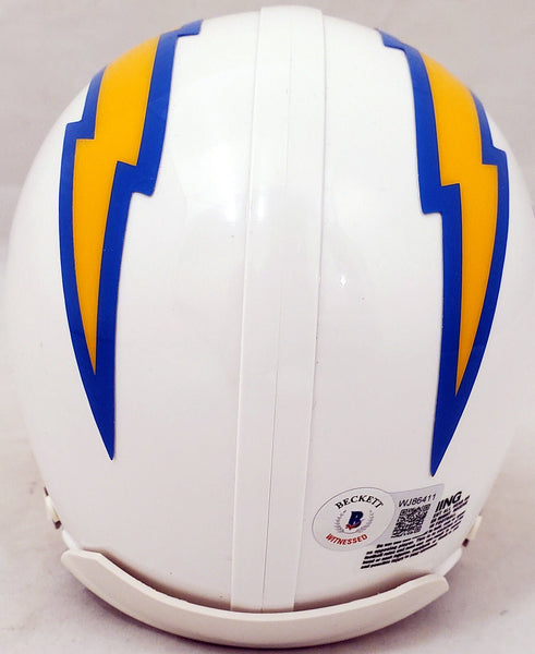 This is a San Diego Chargers White Mini Helmet that has been hand signed by Rodney Harrison. This item has been certified authentic by Beckett Authentication (BAS) and comes with their tamper-proof QR Code sticker that can be verified on the Beckett-authentication.com.