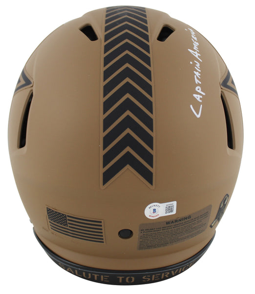 This Autographed Alternate 2023 Salute To Service II Riddell Full Size Speed Proline Helmet W/ Uv Mirrored Back Acrylic Display Case with the inscription of "Captain America, HOF 85" has been Personally Signed by Roger Staubach of the Dallas Cowboys. This item is 100% Authentic to include a hologram by Beckett Authentication Services. This item may come with the new Beckett Authentication hologram that has a scannable QR code rather than the traditional COA. If you would like to have a COA, you are welcome to reach out to Beckett for a printed certification once you receive your item. This is a BAS Witnessed Protection Program item which means a Beckett Authentication Service representative was present when this item was being signed. We conducted an autograph signing with Roger Staubach where multiples of the same item were signed. While the photographs are representative of this item, the size, placement and strength of the signature may vary. Each item is hand signed, therefore, each autograph is unique. This item can be verified through BAS Witnessed.