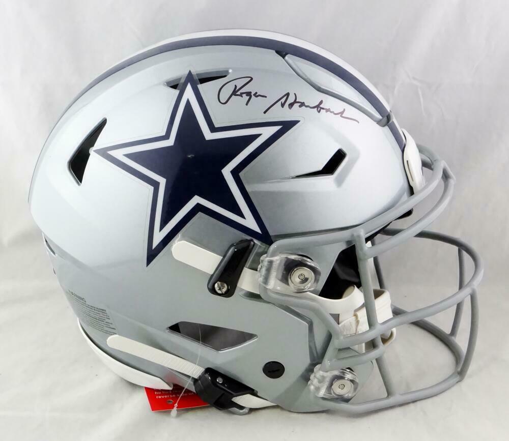 Roger Staubach Autographed Dallas Cowboys F/S SpeedFlex Authentic Helmet- Beckett W*Blk This is a Roger Staubach of the Dallas Cowboys hand autographed Riddell football full size SpeedFlex Authentic helmet. This item has a Beckett Witnessed Authentication, which comes with a Beckett numbered sticker and a matching Certificate of Authenticity. You can view this item on the Beckett Authentication website, it shows when and where the item was signed. It was signed either at a public autograph appearance or a private signing. This is a stock photo of the item. Although you may not receive this exact item, the item you receive is virtually identical, brand new, and in great shape.