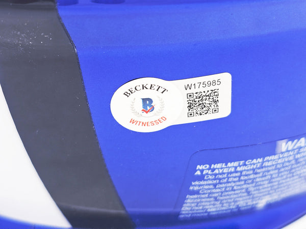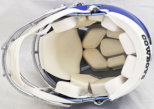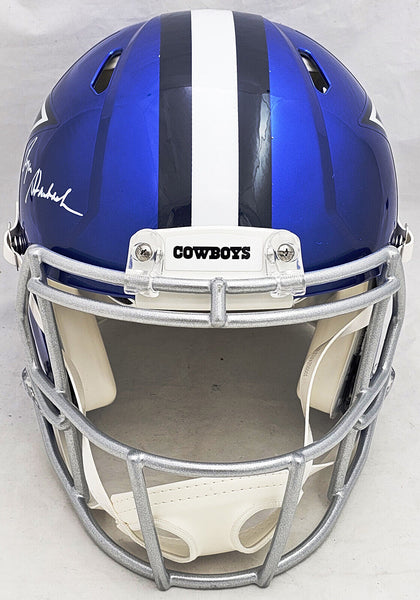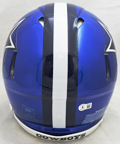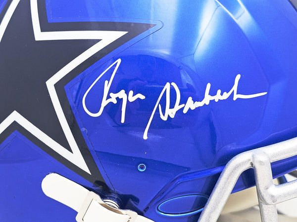 This is a Dallas Cowboys Flash Blue Full Size Authentic Speed Helmet that has been hand signed by Roger Staubach. The Flash helmets are delicate and may have some marks or scratches on them. This item has been witnessed and certified authentic by Beckett Authentication (BAS) and comes with their tamper-proof witness sticker. Beckett Authentication has recently changed their physical certificate card policy where they no longer match their tamper-proof sticker with a physical certificate. A certificate can be printed on Beckett's website for the matching authentication number.