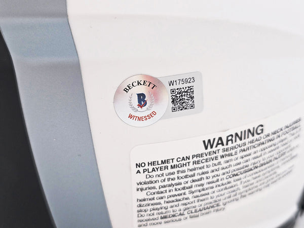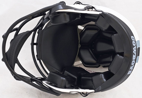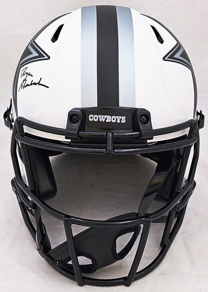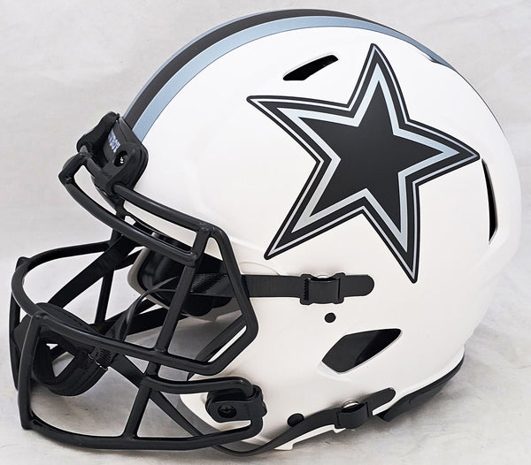 This is a Dallas Cowboys Lunar Eclipse White Full Size Authentic Speed Helmet that has been hand signed by Roger Staubach. The Eclipse helmets are delicate and may have some marks or scratches on them. This item has been witnessed and certified authentic by Beckett Authentication (BAS) and comes with their tamper-proof witness sticker. Beckett Authentication has recently changed their physical certificate card policy where they no longer match their tamper-proof sticker with a physical certificate. A certificate can be printed on Beckett's website for the matching authentication number.