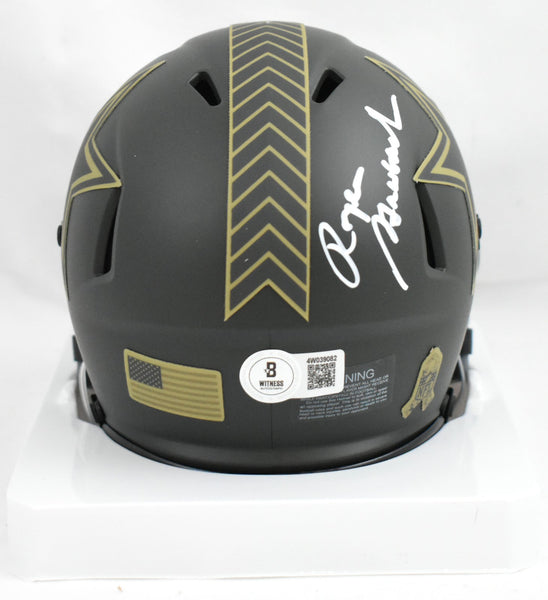 This is a hand autograph of Roger Staubach of the Dallas Cowboys on a Riddell Football Salute to Service 2025 Speed Mini Helmet. This item has a Beckett Witnessed Authentication, which comes with a numbered hologram and a QR code for verification. You can view this item on the Beckett Authentication website, and it shows when and where the item was signed. It was signed either at a public autograph appearance or a private signing. This is a stock photo of the item. Although you may not receive this exact item, the item you receive is virtually identical and brand new in great shape. This is a hand autograph of Roger Staubach of the Dallas Cowboys on a Riddell Football Salute to Service 2025 Speed Mini Helmet. This item has a Beckett Witnessed Authentication, which comes with a numbered hologram and a QR code for verification. You can view this item on the Beckett Authentication website, and it shows when and where the item was signed. It was signed either at a public autograph appearance or a private signing. This is a stock photo of the item. Although you may not receive this exact item, the item you receive is virtually identical and brand new in great shape.