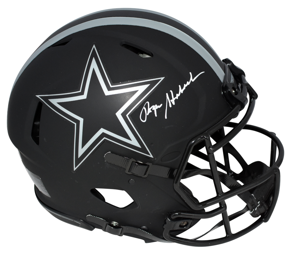 Roger Staubach, former Hall of Fame quarterback for the Dallas Cowboys, has hand signed this Cowboys Riddell Speed Eclipse full-size authentic helmet at a private signing. This helmet is fully padded inside like the ones worn on the field. This item comes with a certificate of authenticity (COA) from Beckett Authentication Services and was signed in the presence of one of their representatives. You will receive a serial-numbered COA along with a matching serial-numbered sticker on the helmet. The authenticity can be verified online by entering the serial number.Item pictured may not be the exact item you will receive. It will be similar quality, and we guarantee your satisfaction.