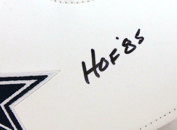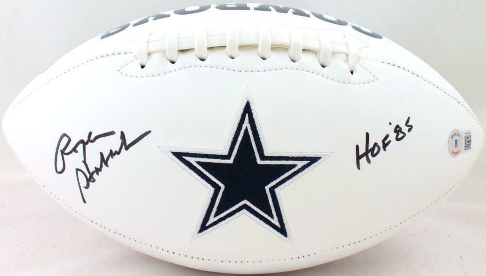 Roger Staubach Autographed Dallas Cowboys Logo Football w/HOF-Beckett W Hologram *Black This is a Roger Staubach of the Dallas Cowboys hand autographed logo football. Inscribed HOF. This item has a Beckett Witnessed Authentication, which comes with a numbered hologram and a generic Certificate of Authenticity. You can view this item on the Beckett website. It was signed either at a public autograph appearance or a private signing. This is a stock photo of the item. Although you may not receive this exact item, the item you receive is virtually identical, brand new, and in great shape.