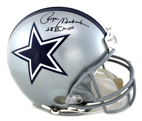 A Dallas Cowboys Riddell Authentic Helmet hand singed by Roger Staubach. The item and signature are in excellent condition. In addition to signing his name, Roger inscribed "SB VI MVP" on the item. Roger is a 2x Super Bowl Champion, Super Bowl MVP and a 6x Pro Bowler. AUTHENTICATION: The item is accompanied by a JSA Certificate of Authenticity - JSA Serial Numbered Hologram