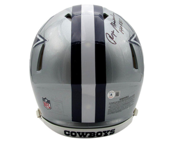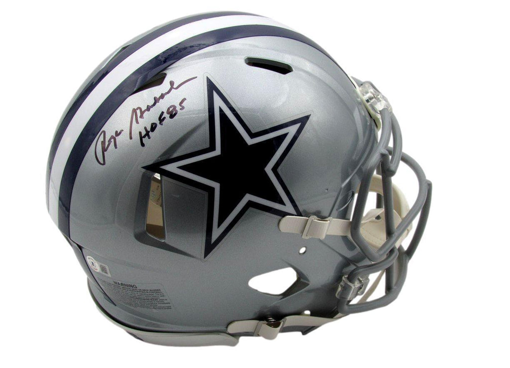 Roger Staubach HOF Autographed/Inscribed "HOF 85" Silver Full Size Speed Authentic Football Helmet Dallas Cowboys. This helmet is authenticated by BAS/Beckett and includes their Tamper-proof Sticker and Certificate of Authenticity.