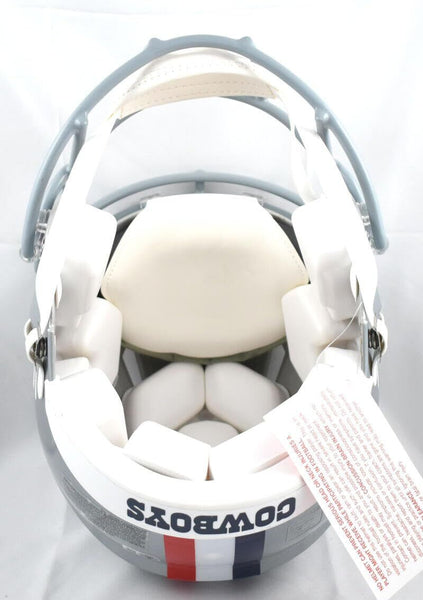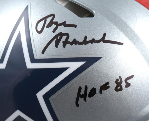 Roger Staubach Autographed Dallas Cowboys F/S 1976 Speed Authentic Helmet w/HOF - Beckett W Hologram *Black This is a hand autographed Helmet of Roger Staubach of the Dallas Cowboys. This is a Riddell Football Full Size 1976 Speed Authentic Helmet. Inscribed HOF. This item has a Beckett Witnessed Authentication, which comes with a Beckett numbered hologram and a QR code for verification. You can view this item on the Beckett Authentication website and it shows when and where the item was signed. It was signed either at a public autograph appearance or a Private Signing. This is a stock photo of the item. Although you may not receive this exact item, the item you receive is virtually identical and brand new in great shape.