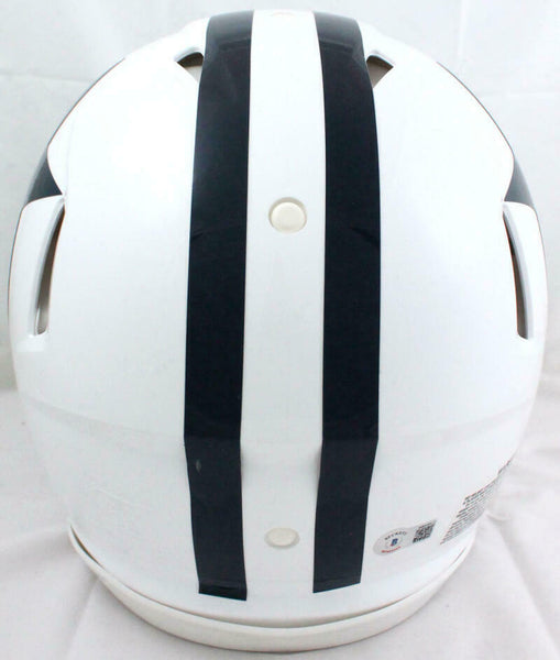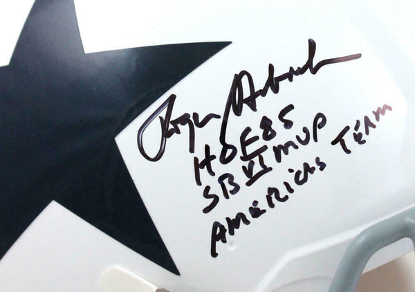 Roger Staubach Autographed Dallas Cowboys F/S 60-63 TB Speed Authentic Helmet w/3 Insc.-Beckett W Hologram This is a hand autograph of Roger Staubach of the Dallas Cowboys on a Riddell Football Full Size 60-63 TB Speed Authentic Helmet and is inscribed with HOF 85,SB MVP and Americas Team. This item has a Beckett Witnessed Authentication, which comes with a Beckett numbered sticker hologram and a generic Certificate of Authenticity. You can view this item on the Beckett Authentication website and it shows when and where the item was signed. It was signed either at a public autograph appearance or a private signing. This is a stock photo of the item. Although you may not receive this exact item, the item you receive is virtually identical and brand new in great shape.