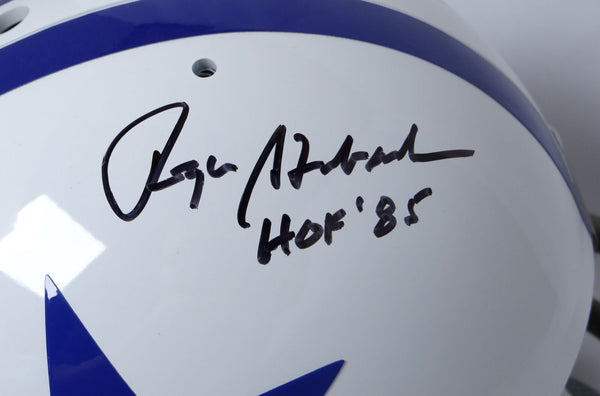 This is a Hand Autographed Helmet of Roger Staubach of The Dallas Cowboys. This is a Riddell Football Full Size TK Helmet. This item has a James Spence Witness Authentication, which Comes with a JSA #'ed Sticker and a Matching JSA COA. You can view this item on the Spence LOA website, and it shows when and where the item was signed. It was signed either at a public autograph appearance or a Private Signing. This is a stock photo of the item. Although you may not receive this exact item, the item you receive is virtually identical and brand new in great shape. We appreciate your interest in our items, and we hope that we can make all transactions professional and satisfying. This is a Hand Autographed Helmet of Roger Staubach of The Dallas Cowboys. This is a Riddell Football Full Size TK Helmet. This item has a James Spence Witness Authentication, which Comes with a JSA #'ed Sticker and a Matching JSA COA. You can view this item on the Spence LOA website, and it shows when and where the item was signed. It was signed either at a public autograph appearance or a Private Signing. This is a stock photo of the item. Although you may not receive this exact item, the item you receive is virtually identical and brand new in great shape. We appreciate your interest in our items, and we hope that we can make all transactions professional and satisfying.