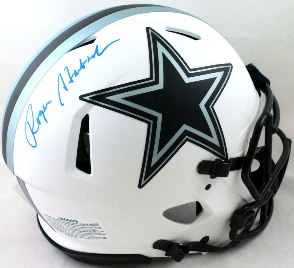 Roger Staubach Autographed Cowboys Lunar Speed F/S Authentic Helmet- Beckett W Hologram *Blue This is a Roger Staubach of the Dallas Cowboys hand autographed Riddell football Lunar Speed F/S Authentic Helmet. This item has a Beckett Witnessed Authentication, which comes with a Beckett numbered hologram and a generic Beckett Certificate of Authenticity. You can view this item on the Beckett Authentication website and it shows when and where the item was signed. It was signed either at a public autograph appearance or a private signing. This is a stock photo of the item. Although you may not receive this exact item, the item you receive is virtually identical, brand new, and in great shape.