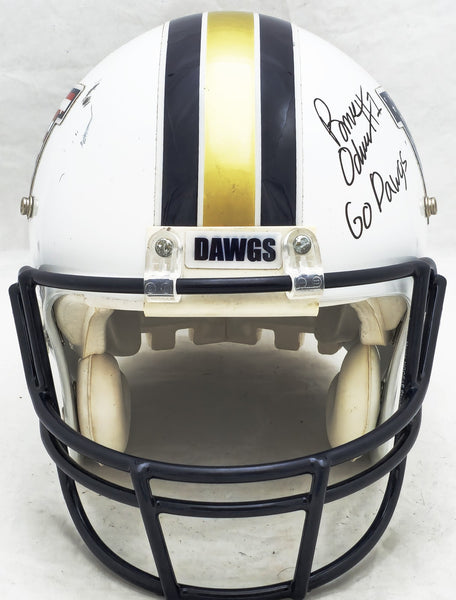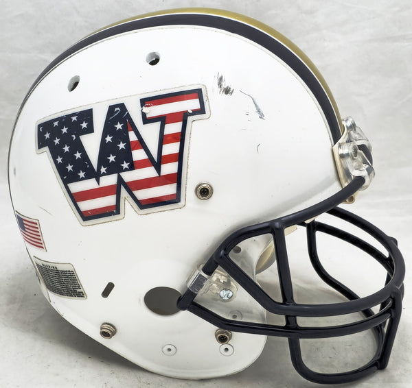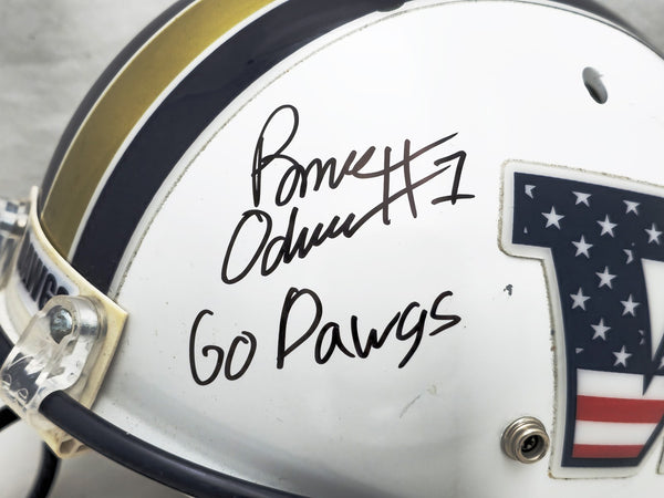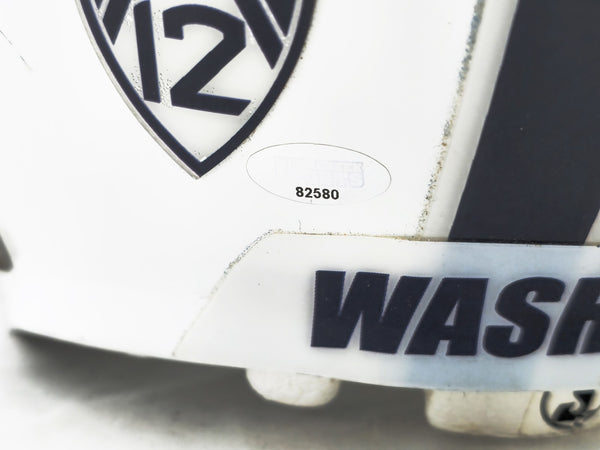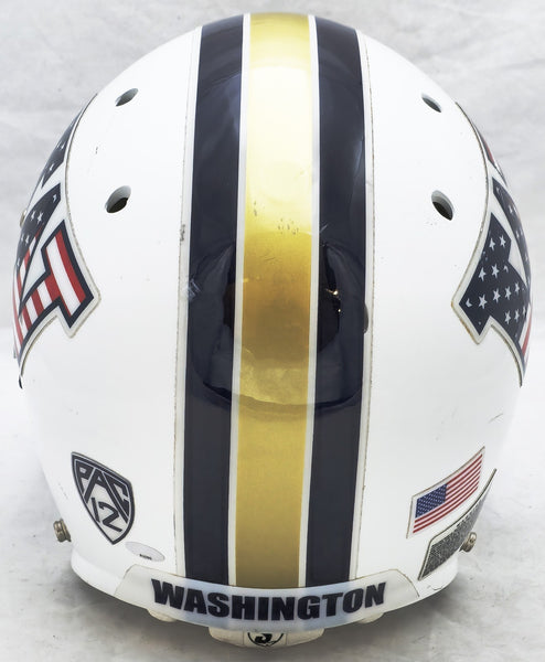 This is a Washington Huskies White USA Flag Full Size Authentic Helmet that has been hand signed by Rome Odunze. This item was inscribed "Go Dawgs." There are marks and scuffs on the helmet as shown. This item was signed in the presence of a Mill Creek Sports representative and comes with their serial numbered hologram and matching certificate of authenticity.