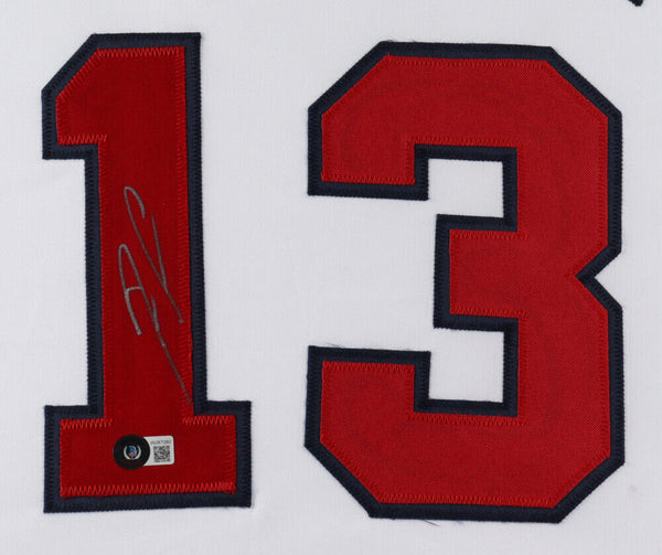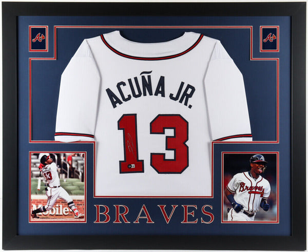 Custom frame measures approximately 35" x 43" in size and features a jersey which has been hand-signed by Ronald Acuna Jr. The lot / autograph(s) includes an official Beckett Authentication Services serially numbered hologram for authenticity purposes. The signing of this item was witnessed by Beckett. Authentication: Beckett Hologram