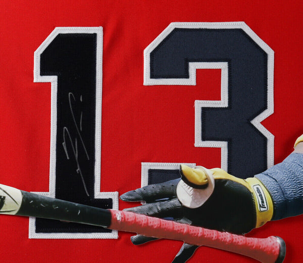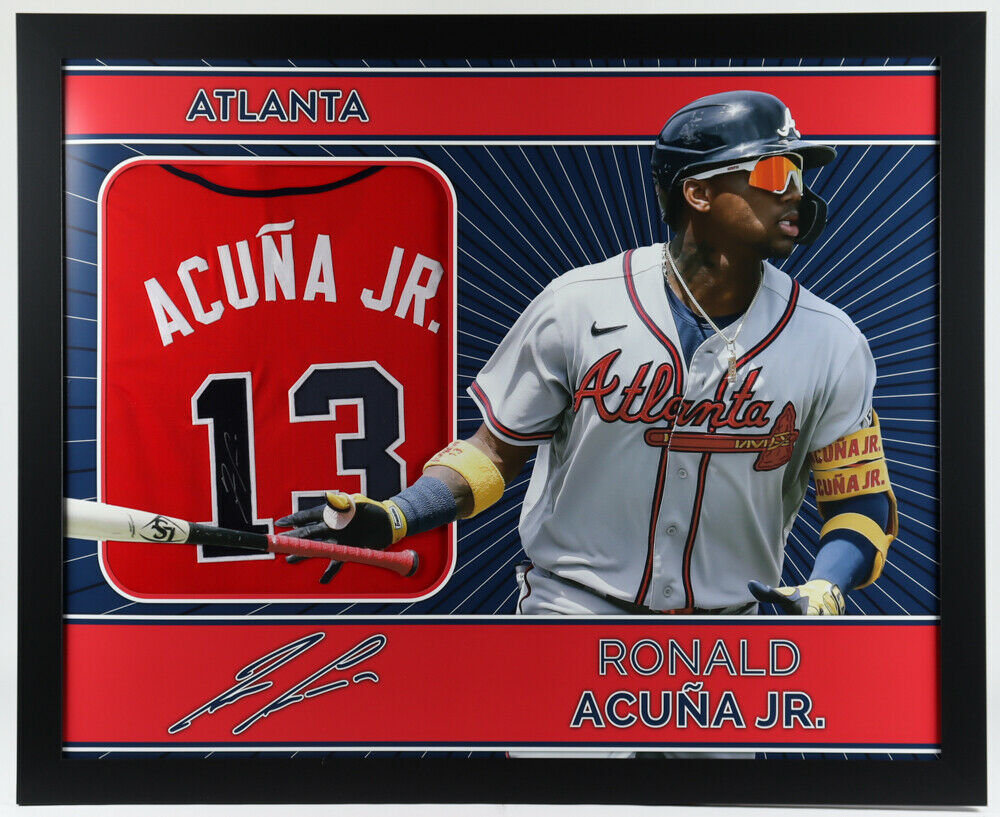 Custom frame measures approximately 35" x 43" in size and features a jersey which has been hand-signed by Ronald Acuna Jr. Please note, display surface has bubbles. See photos.The lot / autograph(s) includes an official Beckett Authentication Services serially numbered hologram for authenticity purposes. The signing of this item was witnessed by Beckett. Authentication: Beckett Hologram