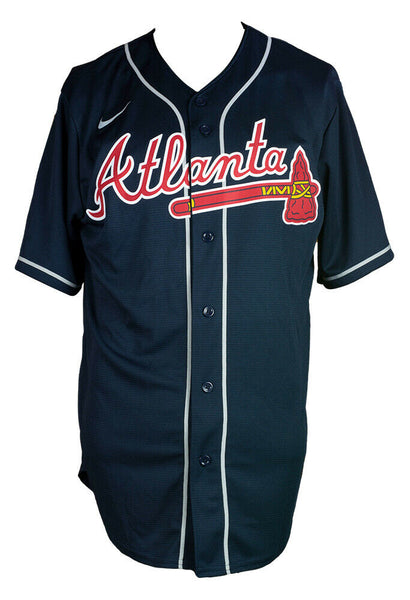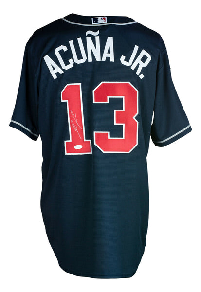 Featured is a Ronald Acuna Jr. signed navy blue Atlanta Braves Nike baseball jersey. This jersey was hand signed by Ronald Acuna Jr. in the presence of a JSA authentication representative. Included with the jersey is a JSA witnessed hologram and certificate of authentication. This jersey would make a great addition to any sports memorabilia collection. . SPECIFICATIONS Autographed By: Ronald Acuna Jr. Team: Houston Astros Sport: Baseball Authentication: James Spence Authentication (JSA)