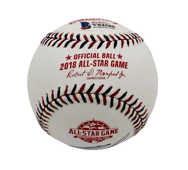 An Atlanta Braves Rawlings Official Major League 2018 All Star MLB Baseball hand signed by Ronald Acuna Jr. The item and signature are in excellent condition. Ronald is a professional baseball player who plays outfield. He won the National League Rookie of the Year award and the Silver Slugger award in 2018. AUTHENTICATION: The item is accompanied by a Beckett Certificate of Authenticity - Beckett Serial Numbered & Databased Holograms