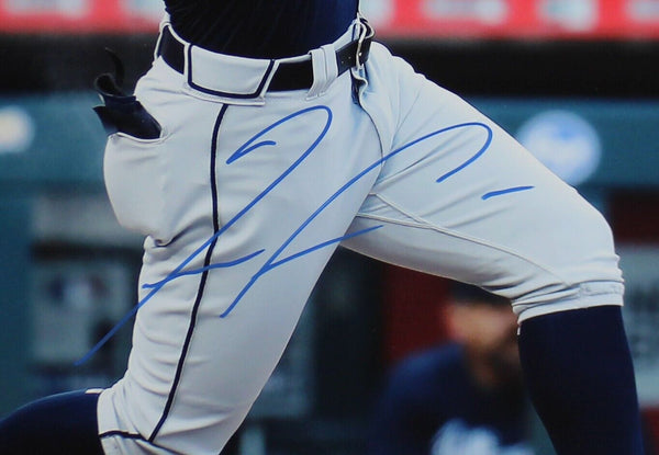 A Atlanta Braves Unframed 16x20 NFL Photo - Blue Jersey Grand Slam hand signed by Ronald Acuna. The item and signature are in excellent condition. Ronald is a professional baseball player who plays outfield. He won the National League Rookie of the Year award and the Silver Slugger award in 2018. AUTHENTICATION: The item is accompanied by a JSA Certificate of Authenticity - JSA Serial Numbered & Databased Hologram