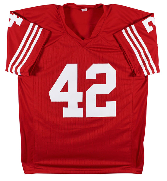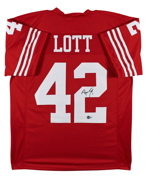 This Autographed Red Pro Style Jersey has been Personally Signed by Ronnie Lott of the San Francisco 49ers. This item is 100% Authentic to include a hologram by Beckett Authentication Services. This item will come with an affixed Beckett Authentication Services (BAS) authentication sticker, which includes a scannable QR code to verify authenticity. Please note that Beckett no longer provides serial-numbered COA cards, and the attached BAS sticker will serve as the complete authentication for this item. This is a BAS Witnessed Protection Program item which means a Beckett Authentication Service representative was present when this item was being signed. We conducted an autograph signing with Ronnie Lott where multiples of the same item were signed. While the photographs are representative of this item, the size, placement and strength of the signature may vary. Each item is hand signed, therefore, each autograph is unique. This item can be verified through BAS Witnessed. This is a X-Large sized, non-branded, custom-stitched Jersey.